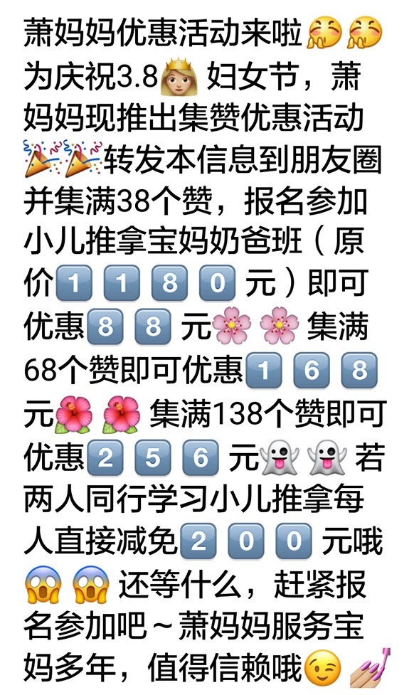 3.8女王节快到啦,小儿推拿宝妈奶爸班也将在3.10号开课咯,如此良辰吉日怎能不碰出一丝火花?!看我看我快看我,集赞优惠大!放!送!!!